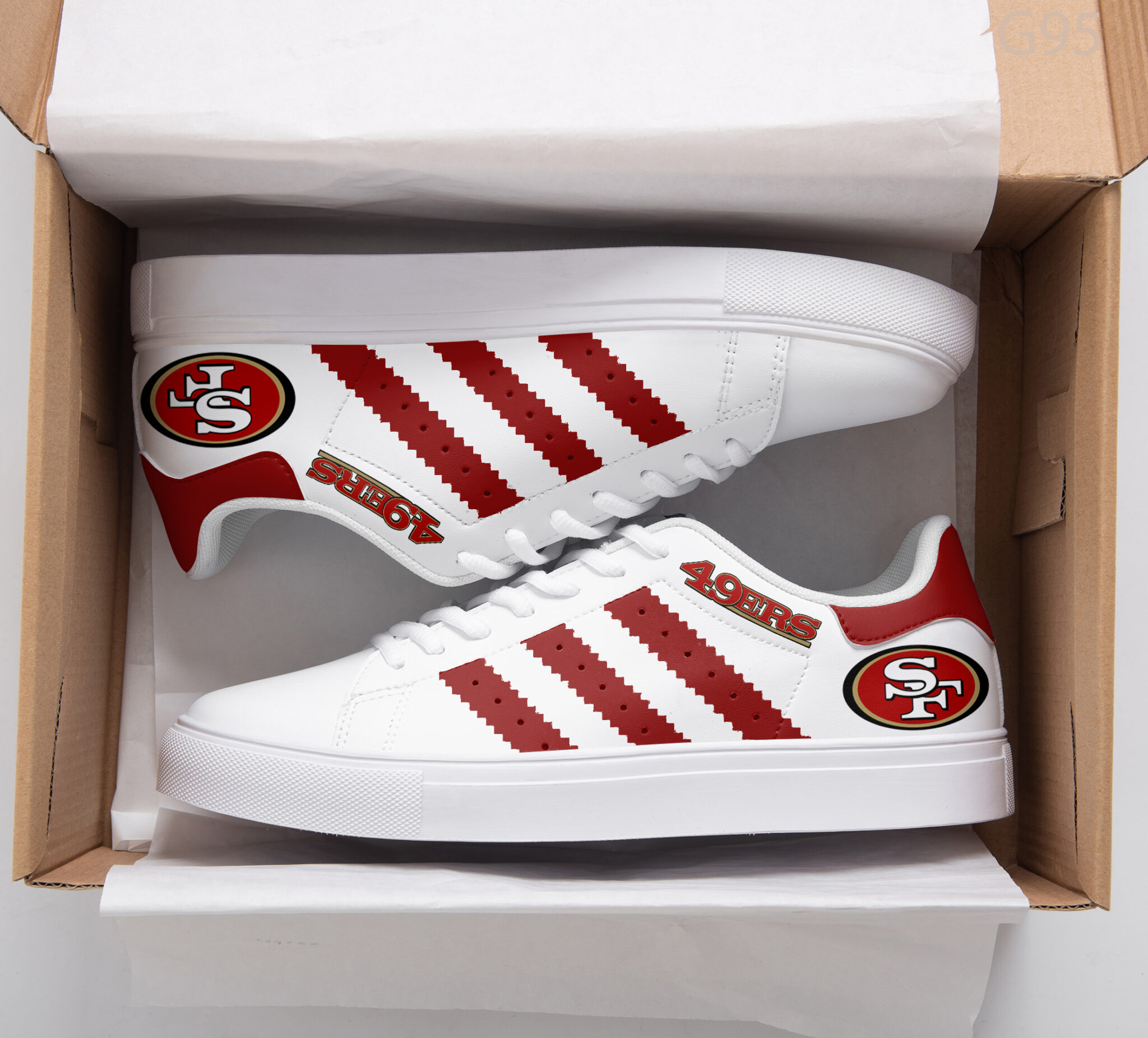 Embroidered contrast leather heel patch with embossed Trefoil logo.